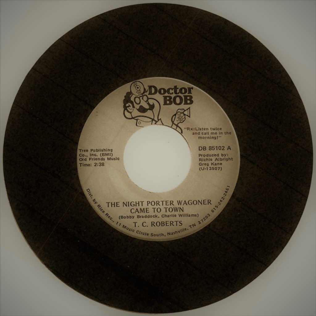 That Crabb would end up recording the song was by no means a given.  Braddock already had recorded a demo (you can listen to it here), while Crabb’s label was the quirky indie Doctor Bob Records, run by a music-loving radiologist in western Massachusetts who acted as a patron for musicians whose work appealed to him, including Tabby Crabb.  Crabb was involved in running the label, as well as releasing records both as Tabby Crabb and as T.C. Roberts; but, as far as I can determine, “The Night Porter Wagoner Came to Town” was the label’s biggest release, and none of its other artists (including The Brickers, Bill Filder and Mercedes) ever got any further than Crabb did.  A release on Doctor Bob Records wasn’t what Braddock and Williams had in mind, in short, and it’s fair to assume that Williams had pitched it unsuccessfully to numerous other artists and labels before he OKed a recording by Crabb on Doctor Bob Records.