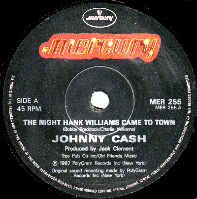 I didn’t initially recognize it as a mystery.  It started out looking like a song: “The Night Hank Williams Came to Town” (1987).  It’s a pretty high-profile song, one that’s about, sung by, produced by and co-written by five members of the Country Music Hall of Fame:  The subject, obviously, is the iconic Hank Williams; the singer was the almost-as-iconic Johnny Cash, with his outlaw partner Waylon Jennings contributing backup videos; the producer was Cowboy Jack Clement; and the writer was Bobby Braddock, who co-wrote the song with Charlie Williams, another veteran songwriter with a string of hits to his name.